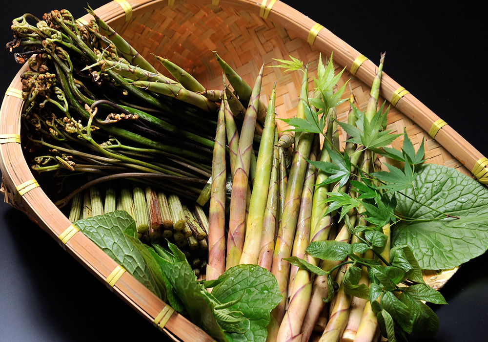 信州の山奥にある土地柄、地元の食材の宝庫でもあります。春は山菜(ふきのとう、こごみ、うど、わらび、根曲り竹)、夏はたけのこ、秋はきのこ、冬は地元野菜を使い、山田館でしかお召し上がりいただけないお料理をご用意しております。